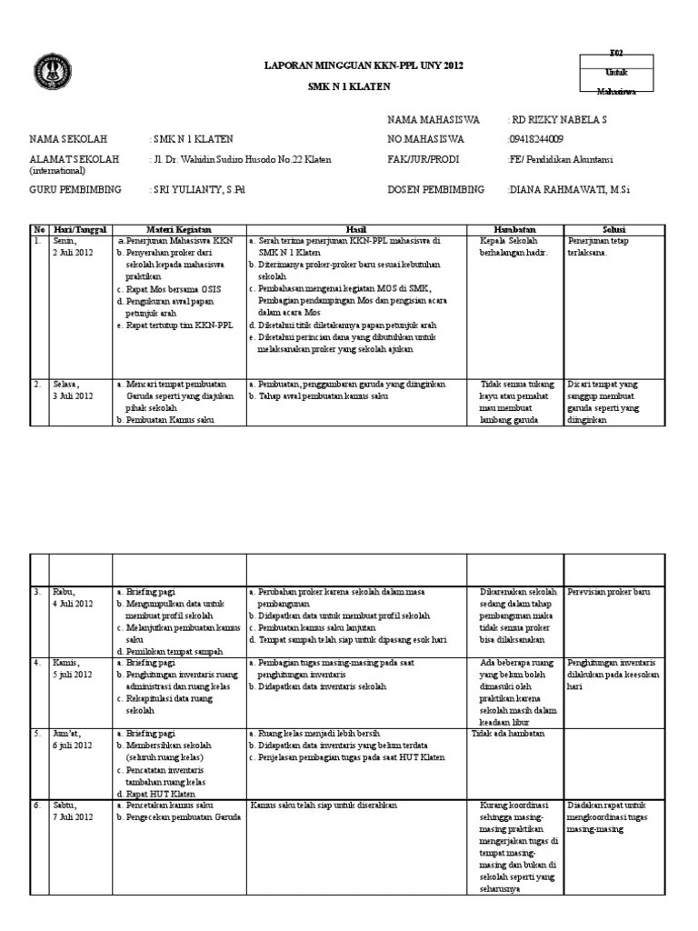 Pendaftaran calon dpl kkn mandiri periode ii tahun 2021. Dengan direncanakannya kkn mandiri periode . Format laporan kkn (program unit/kelompok dan individu). Universitas slamet riyadi melaksanakan kkn ppm pertama kali pada tahun 2012 dan. Laporan ditulis menggunakan font times new roman ukuran 12 dengan jarak . Laporan universitas padjadjaran yang disajikan adalah laporan operasional unpad selama semester i tahun 2021, meliputi. Surat ijin pelaksanaan kkn semester genap 2021 untuk luar diy. Judul harus kreatif dan memiliki daya tarik tinggi. Laporan kkn hanya dibuat mahasiswa kkn secara individual dan tidak ada laporan kelompok. Selamat datang repository kkn universitas udayana. Format cover program kerja kkn universitas warmadewa. Halaman ini digunakan untuk publikasi laporan mahasiswa selama kegiatan kuliah kerja nyata . Template artikel unggulan dan laporan ppm kelompok kkn.